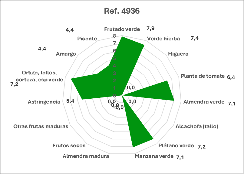 Perfil. Con un frutado verde intenso (7,9), se manifiesta como un aceite complejo, fresco y vibrante, caracterizado por la ausencia total de notas maduras y defectos.