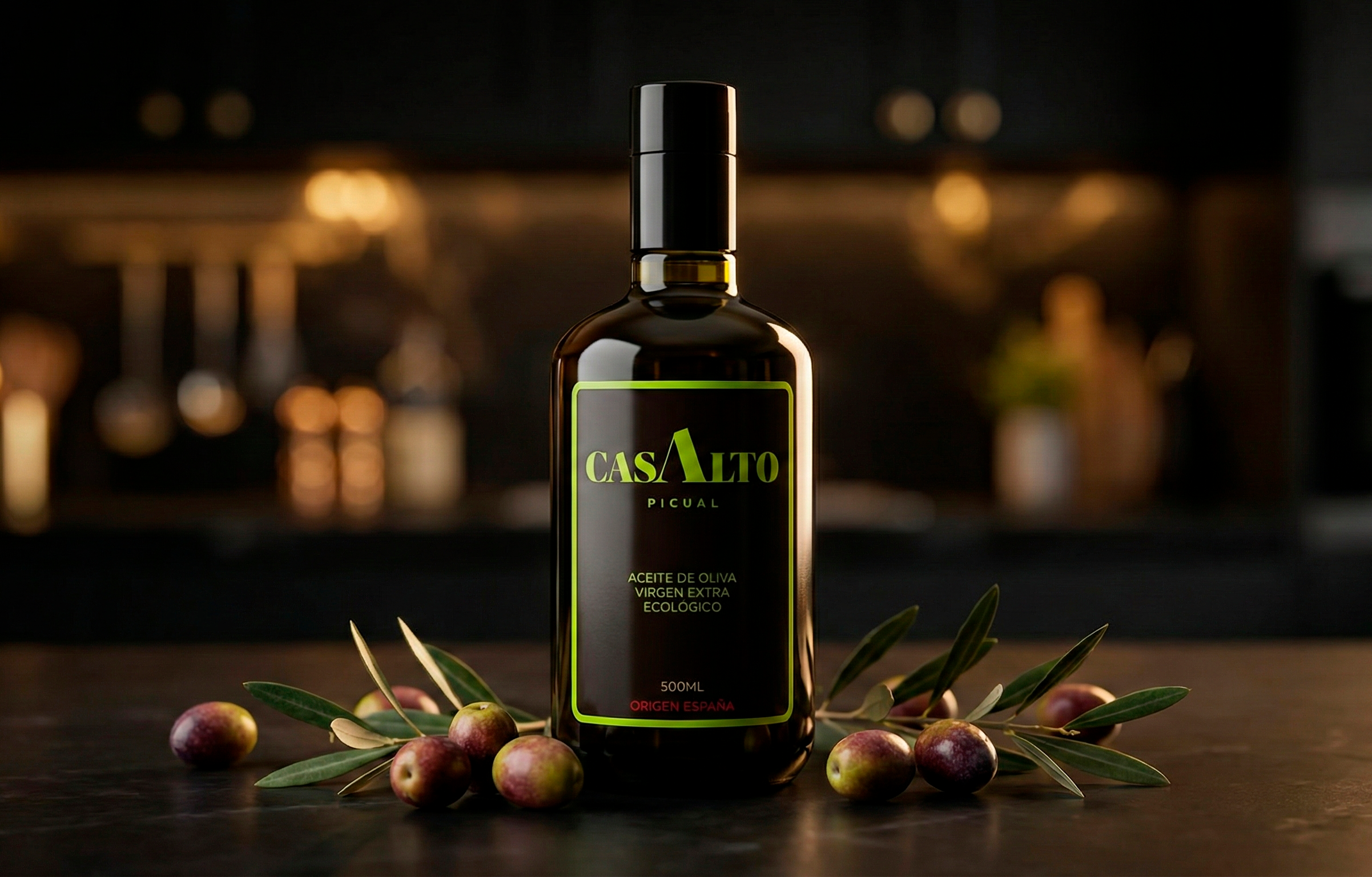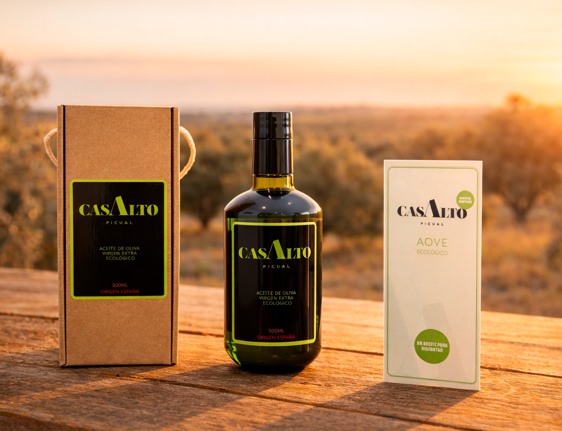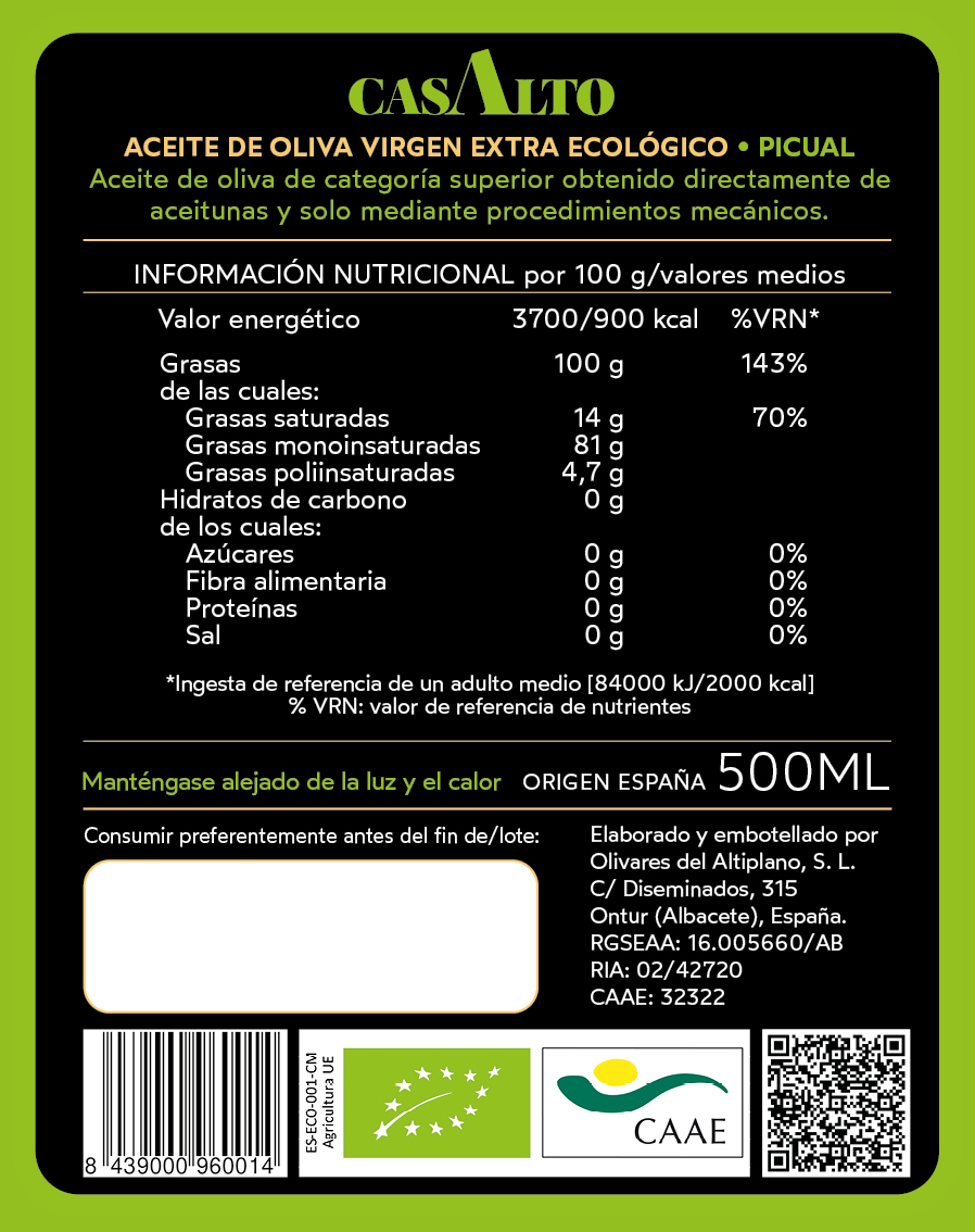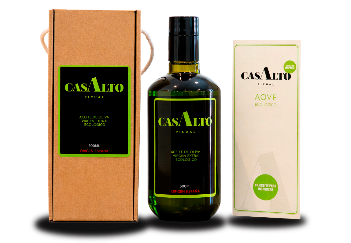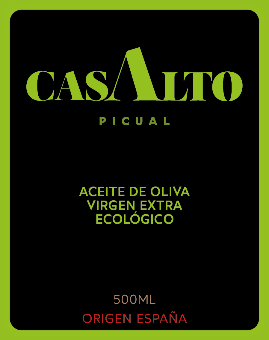 Aceite de Oliva Virgen Extra de calidad superior de variedad exclusivamente picual. AOVE procedente de cultivo 100% ecológico certificado.